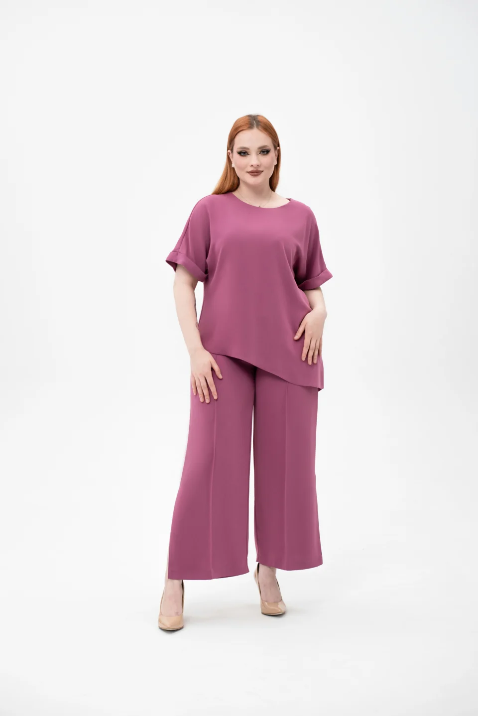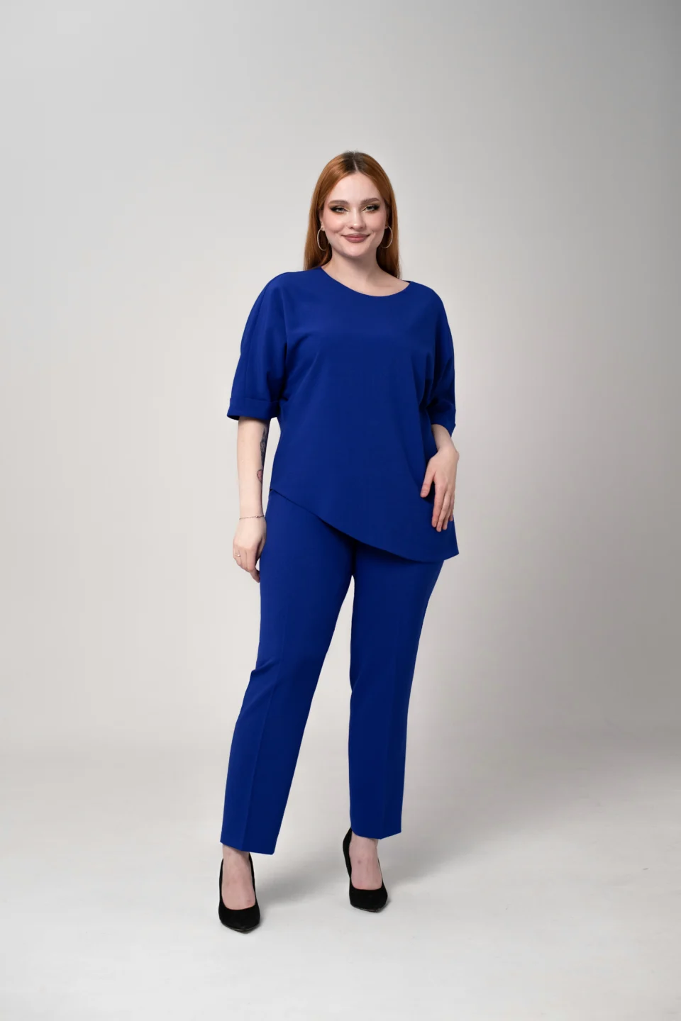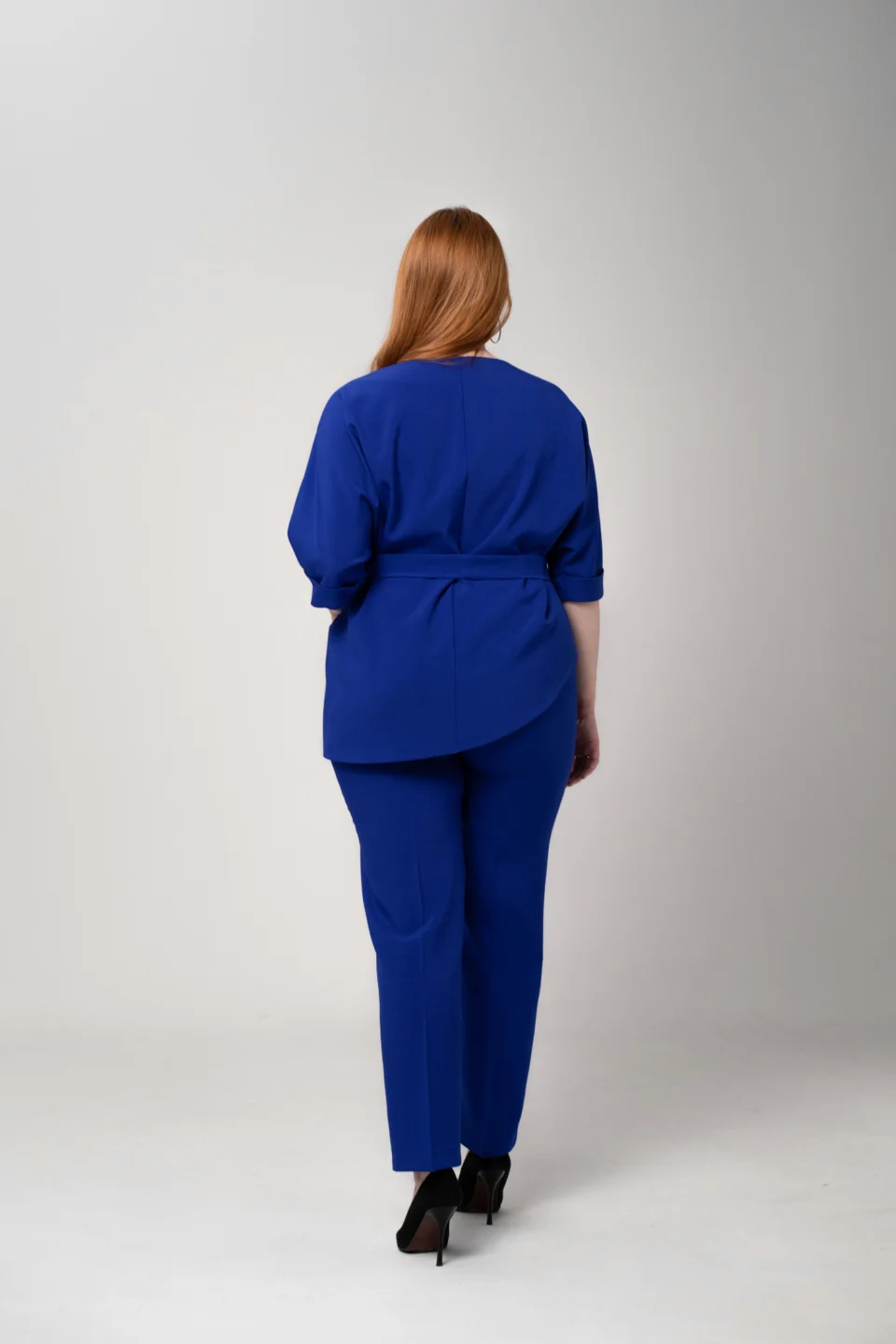 Брюки классической посадки, слегка заужены книзу, по верху расположен притачной пояс с мягкой эластичной резинкой.